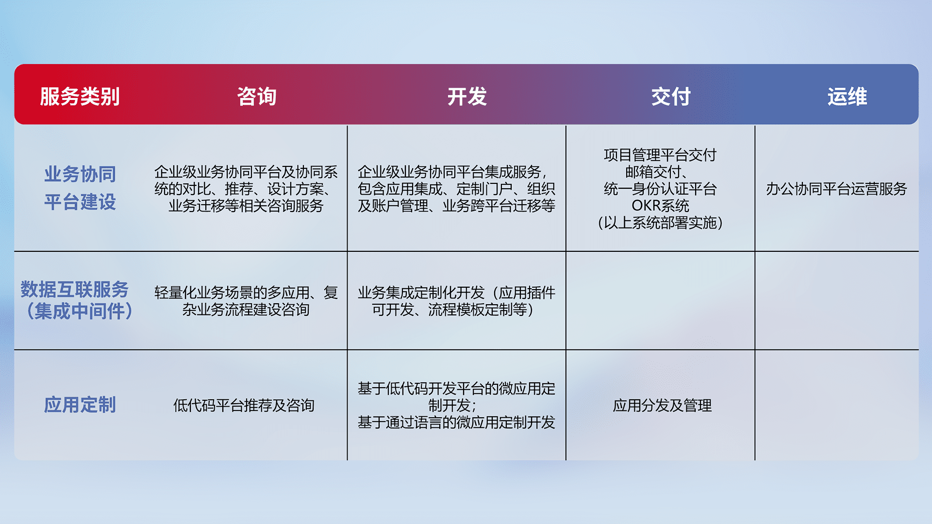 针对钉钉、、、、企微、、IDaas等平台级产品提供产品的规划、、方案、、交付、、、、定制化开发等服务,,,,实现如统一协同办公、、、智能客户服务、、、、混合会议管理、、、智能数据查询、、等业务场景,,实现数字化转型。。。